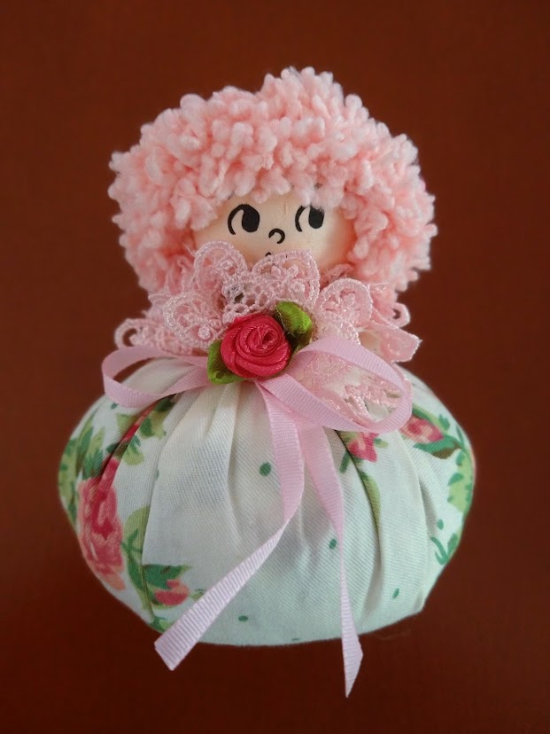 Je ušitá z bavlněné látky, zdobená paličkovanou krajkou, mašličkou a umělými růžičkami. Má vatovou hlavičku s roztomilým obličejem a ručně háčkovaným kloboučkem, který ji moc sluší!