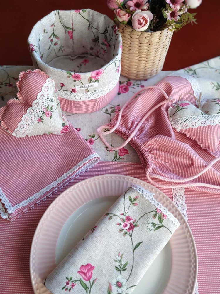 Ve venkovském designu, vzor růží na režném podkladu v kombinaci s kanafáskem. Z obou stran je zdobený bílou paličkovanou krajkou, jednoduché praktické zatahování na dvě šňůrky v barvě krajky. Vhodný tedy i na zavěšení či přepravu.