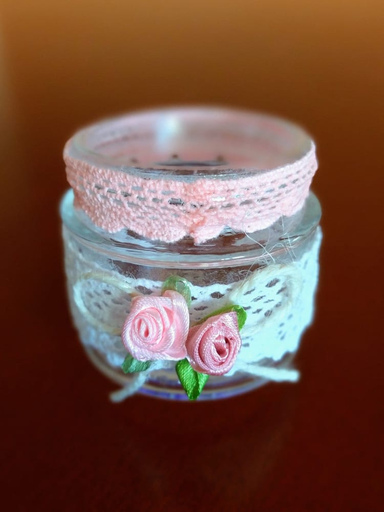 Romantický svícen na čajovou svíčku dekorovaný jutou, krajkou a umělými růžičkami