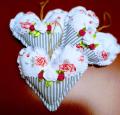 Zdobené bílou paličkovanou krajkou a umělými růžičkami. Druhá strana bez přízdob . Plněné dutým vláknem, poutko na zavěšení z jutového provázku.
