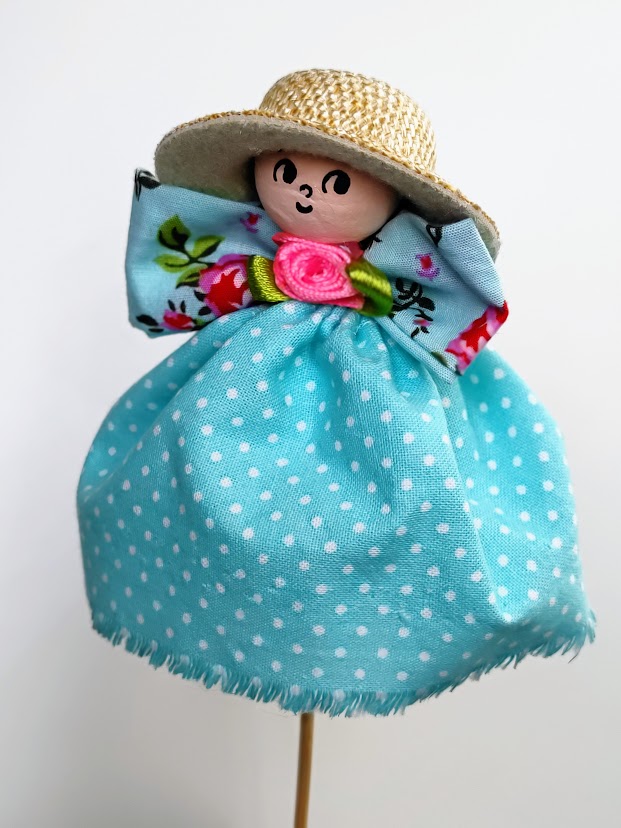 Panenka na špejli v různých variantách tyrkysových šatiček, na hlavičce slaměný klobouček, zdobená umělými růžičkami.