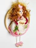 Roztomilá zrzka ve smetanových šatičkách s růžičkami, na bambusovém kolečku o pr.12 cm, zdobená mašličkami, krajkou, perličkami a knoflíkem, v ručičkách nápis "Vítejte", nožičky z dřevěných korálků na šňůrce.