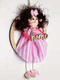 Roztomilá brunetka v růžových pruhovaných šatičkách, na dřevěném kolečku o pr.12 cm, zdobená mašličkami, perličkami a růžičkou, v ručičkách nápis "home", nožičky z dřevěných korálků na šňůrce.