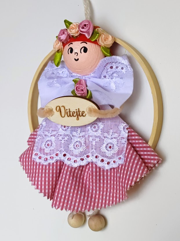 Krojovaná panenka v designu šlapanického kroje, v růžové sukýnce se zástěrkou z madeiry, červeným čepečkem a věnečkem z umělých růží. Panenka je na bambusovém kolečku o pr.12 cm, v ručičkách nápis "Vítejte", nožičky z dřevěných korálků na šňůrce.
